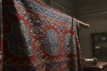 Syrian artisans created luxurious brocade fabrics with metallic Khamsa patterns woven into silk. These textiles were used for ceremonial garments, cushions, and wall hangings. The Syrian civil war has tragically disrupted this centuries-old craft tradition.