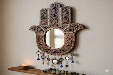 Moroccan metalworkers create mirrors framed in hand-shaped brass or copper. These serve a dual symbolic purpose: the mirror reflects the evil eye back to its sender, while the Khamsa hand provides an additional layer of protection. The metalwork is often inlaid with colored glass or bone.