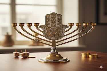 Israeli artists create Hanukkah menorahs (nine-branched candelabras) incorporating Hamsa designs. These Judaica pieces combine religious function with protective symbolism, often featuring the hand as the central shamash (helper candle) holder. Materials range from brass to glass to ceramic.