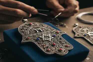 Yemenite Jewish silversmiths created distinctive Hamsa pieces characterized by their delicate filigree work and architectural quality. These pieces often incorporate Hebrew letters, Stars of David, and granulation techniques. Yemenite Jewish jewelry is considered among the finest in the Jewish silverworking tradition.